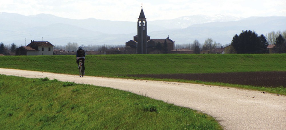 Superati centri commerciali e fabbriche, posti dall’altra parte della sede stradale, dopo San Rocco, arriviamo alle porte di Guardamiglio e ci colleghiamo con l’argine principale piegando leggermente a sinistra. Qui finisce la parte protetta; da qui in avanti si prosegue in tranquillità ma sempre guardinghi allo scarso traffico veicolare. Cascine sparse, pioppeti, corvi, gazze e qualche airone che, con le loro traiettorie, solcano l’aria, trattori al lavoro; un ritratto a 360 gradi di un mondo contadino che sembra ancora vivo. Dalla modesta altezza dell’argine è possibile vedere una grande fetta di pianura, campanili tra gli alberi, sentieri che si perdono nei campi, borghi disseminati tra un mare di verde. All’altezza di Valloria, sulla nostra sinistra ecco il profilo delle “nostre” montagne.